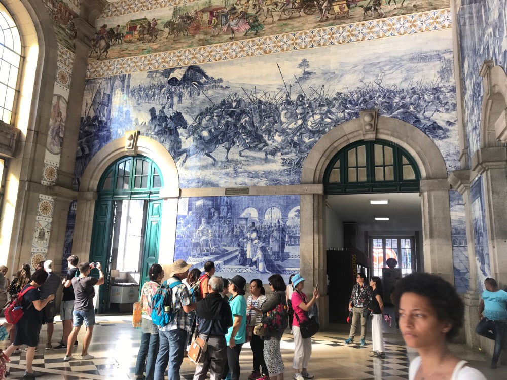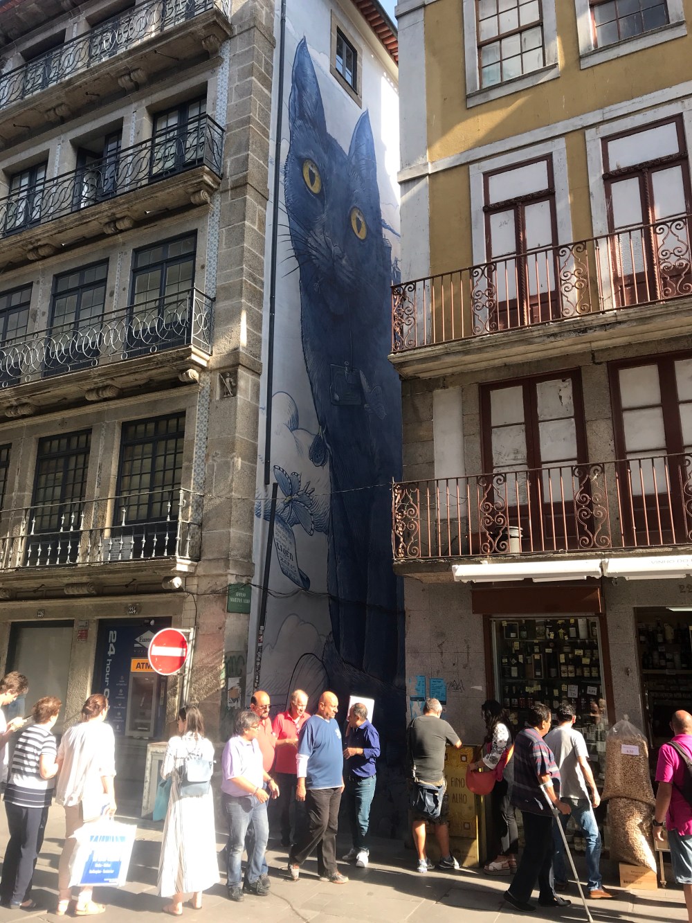 I especially like the huge black cat peeking out from between the buildings…and the murals in the railway station!