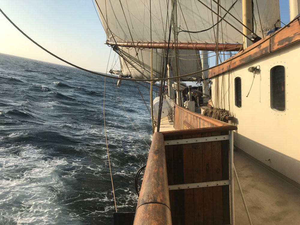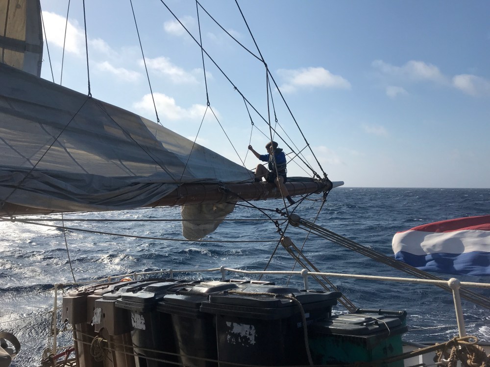 Reefing the mizzen. Gaia out on the boom lashing the new clew
