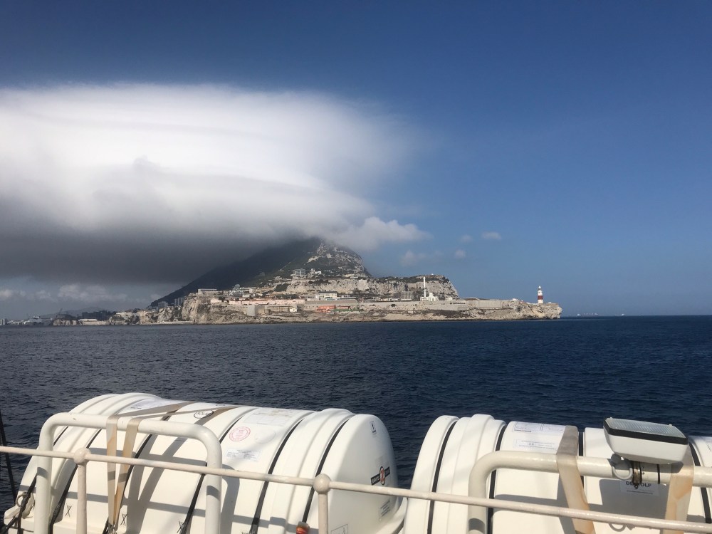 Sunrise in the Strait of Gibraltar. Morocco on the starboard bow and Europe on the port bow.